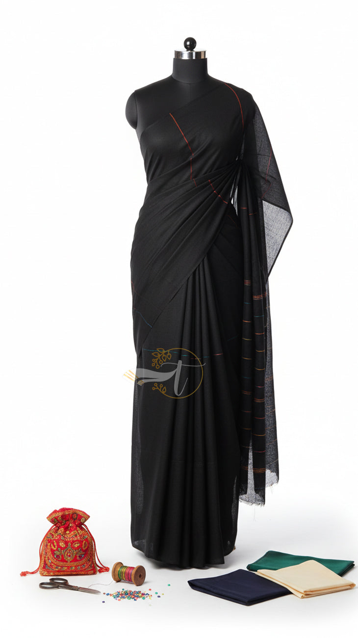 Woman wearing a black and purple saree with a pink blouse against a pink background
