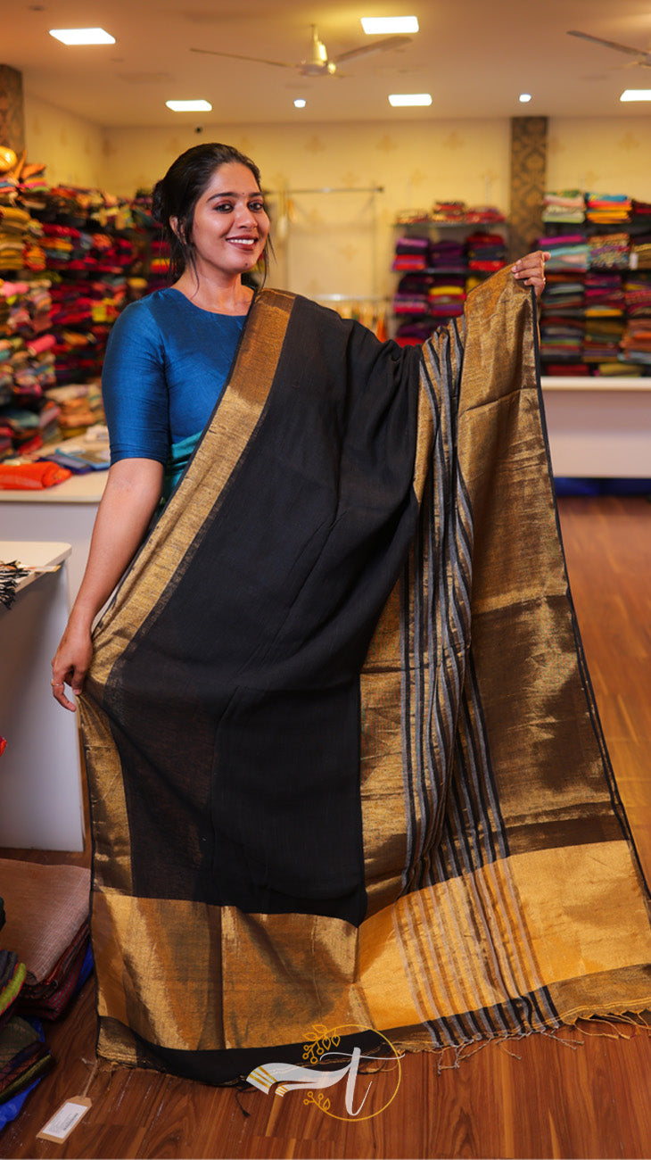 Woman wearing a gold velvet saree with a blue blouse against a patterned wall.