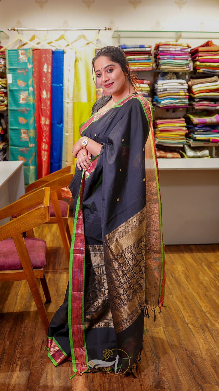 Woman in a black saree with gold border standing outdoors on a sunny day.